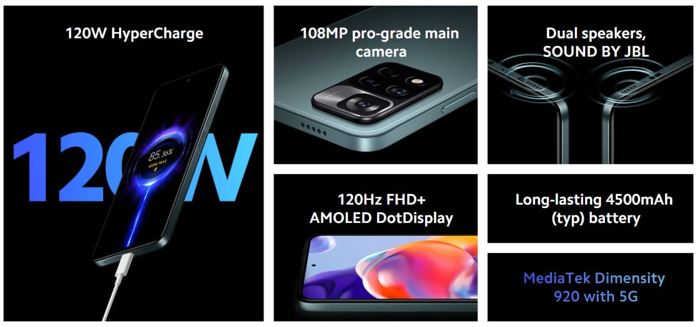 今回紹介する11 Pro+ 5Gは、MediaTekを搭載したモデル(無印11 Pro)のSoCがMediaTek Dimensity 920にアップデートされ、5Gに対応し、120Wの高速充電に対応したモデルになります。