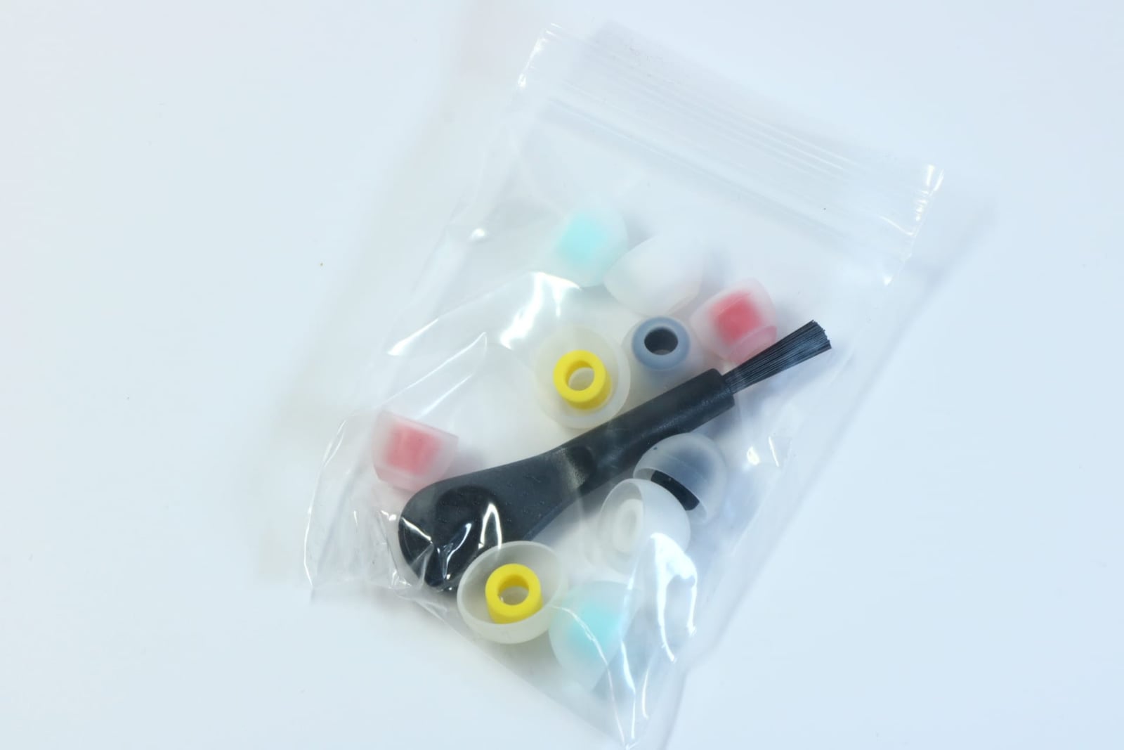イヤホンの形状の関係上、グイッと押し込む感じになるので、他のイヤホンより小さめのイヤーピースが合うかなと思います。