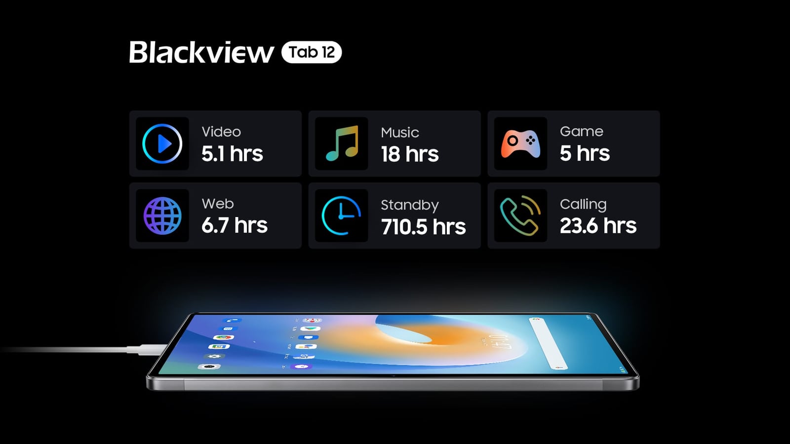 Tab 12はTab 8と同じバッテリーを搭載しているが、より高度なアルゴリズムと成熟したテクノロジーによって、Tab 12の6580mAhバッテリーは前世代の二倍長持ちし、ユーザーはゲームの最後の敵に勝ったり、VIPクライアントと重要な通話をしたりしながら、バッテリーの不安を取り除くことができる。Blackview研究所で実施されたバッテリテストによると、Tab 12は、音楽再生に18時間、通話に23.6時間、ビデオ再生に5.1時間、スタンバイ状態でも710.5時間使用できます。