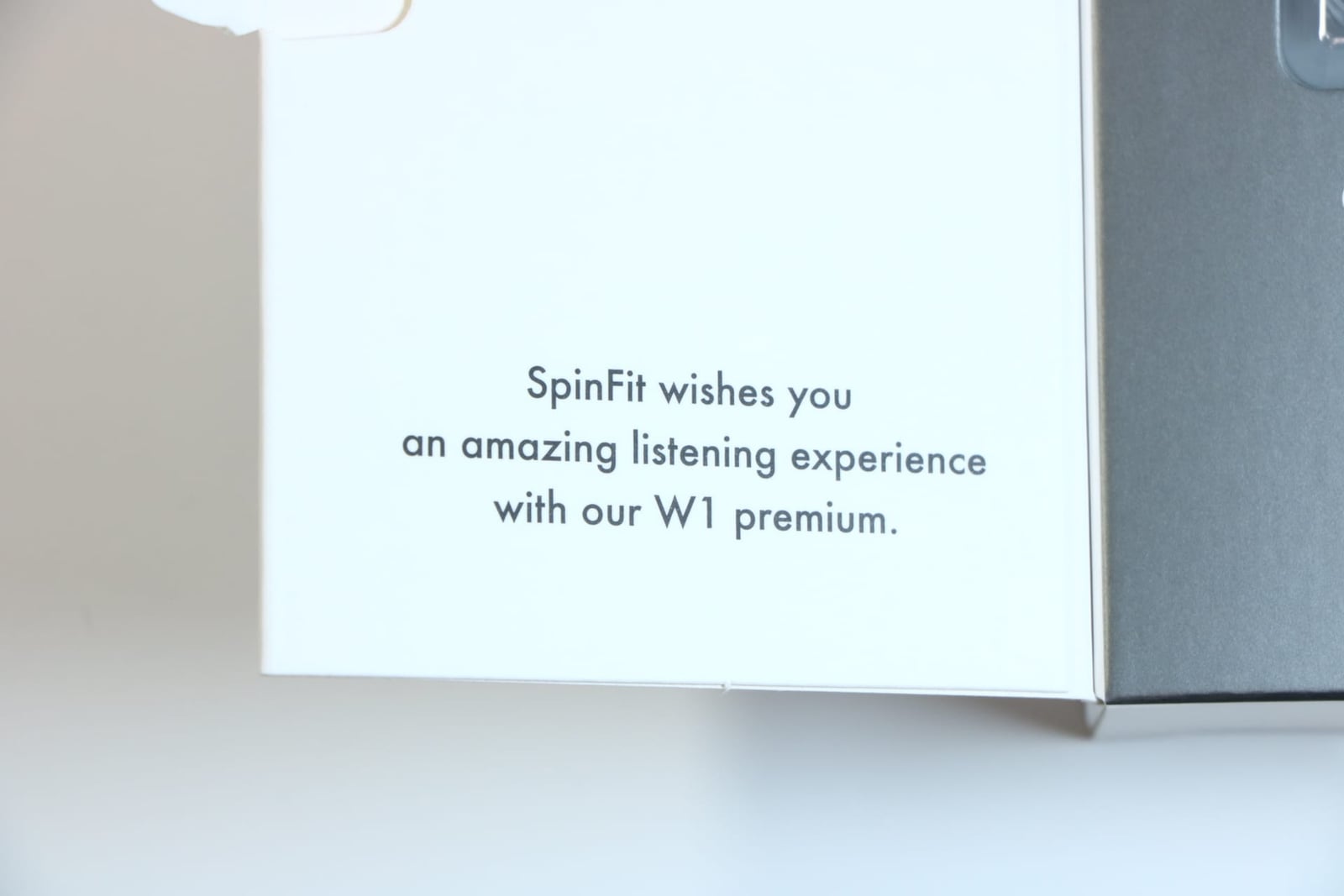 見開きには、「SpinFit wishes you an amazing listening experience with our W1 premium.(SpinFitは、W1プレミアムで素晴らしいリスニング体験をされることを祈っています。)」という文字がありあます。