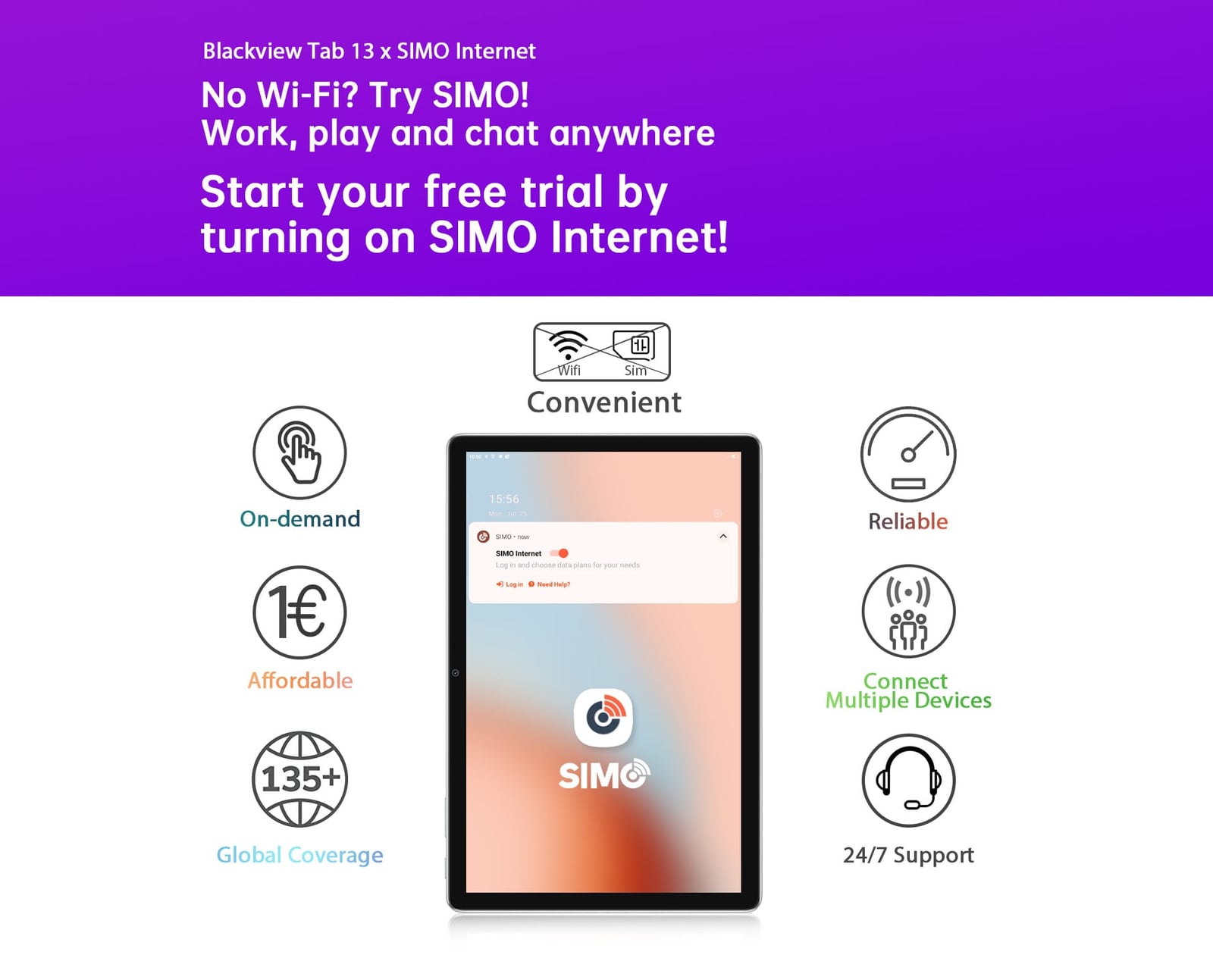 Blackview Tab 13のもう一つの特徴は、SIMOが提供するSimo Internetです。SIMOは、複数の通信事業者の中から利用可能な最良のローカルネットワークに自動的に切り替えることにより、いつでもどこでも中断されない高速モバイルインターネットをスマートデバイスのユーザーに提供する会社です。