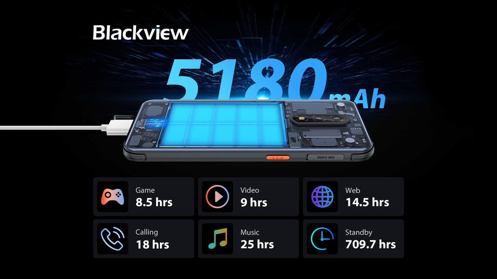 タフネスでありながら軽量でスリムなボディの中に、Blackview BV5200は5180mAhのバッテリーを搭載しています。BV4900と比較すると、容量が小さくなっています。しかし、Doke OS 3.0によるバッテリー消費に関するソフトウェアの強化により、BV5200はBlackview Laboratoryの連続使用テストに基づいて、ゲーム、ウェブブラウジング、スタンバイでの長寿命化を実現しました。また、逆充電にも対応しており、コンセントのない場所でも他のデバイスに充電することができます。