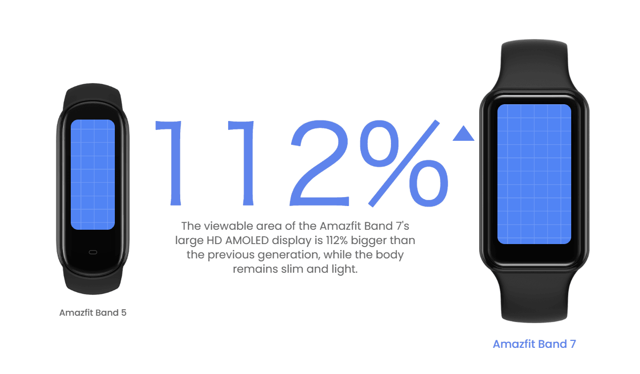 旧モデルに当たるAmazfit Band 5と比べ、画面が112%大型化しているとのこと。