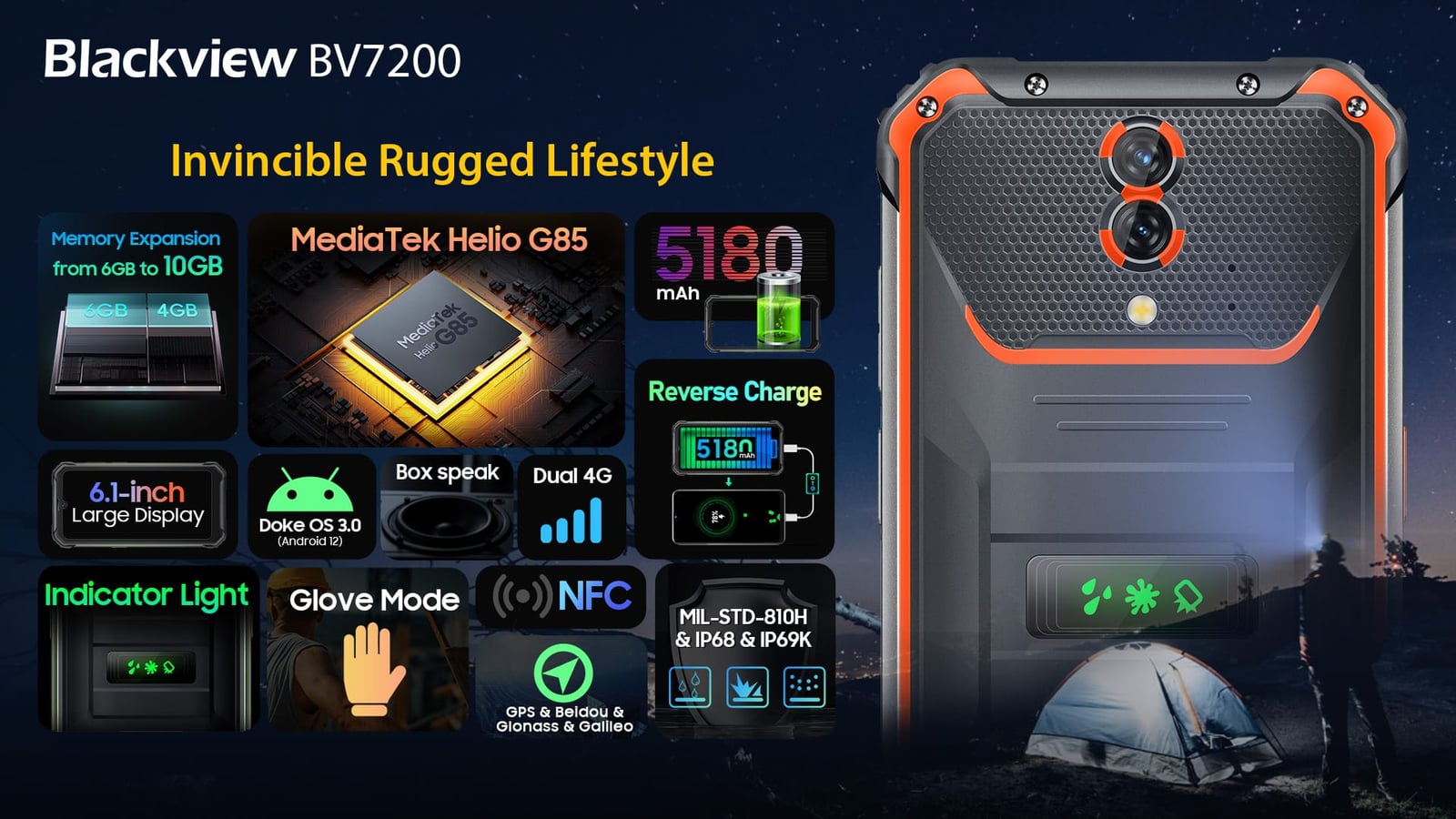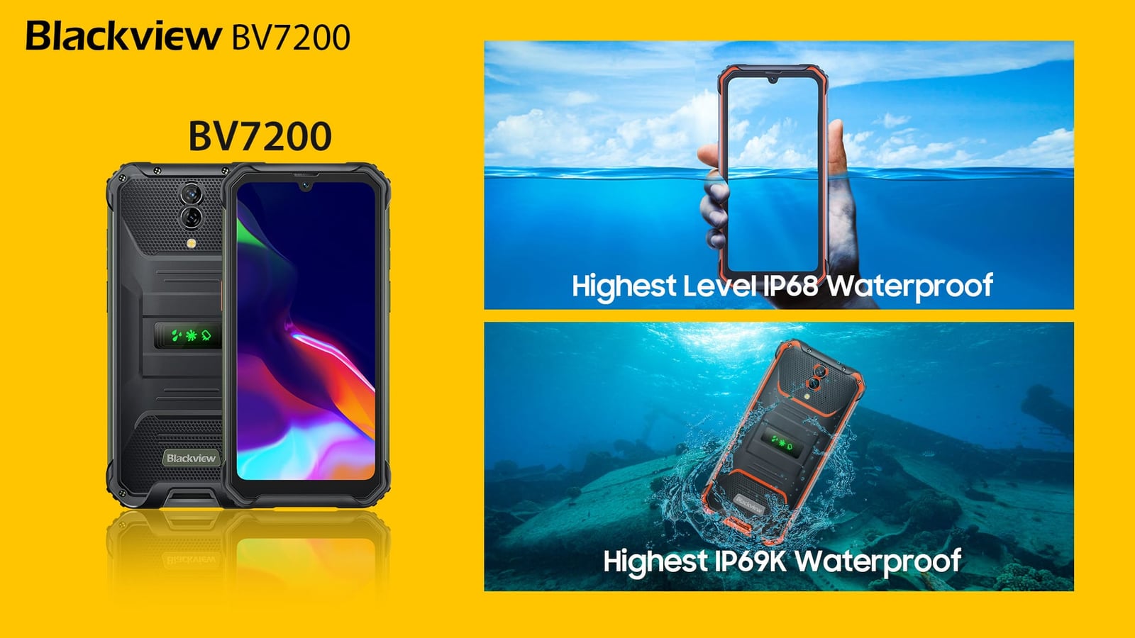 Blackview BV7200は最高のIP68及びIP69K防水性能、MIL-STD-810Gより高いMIL-STD-810H軍事規格保護性能を備え、あらゆる野外課題に立ち向かう強靭な戦士となる予定である。その8MPフロントサムスン®S5K4H7カメラ&50MPリアサムスン®ISOCELL JN1+117°ultra wideと超マクロ8MPリアカメラは、すべてのあなたの喜びと忘れられない屋外の瞬間をキャプチャします。また、6GB RAMと最大4GB RAMの拡張機能により、OSをより高速に実行でき、128GBと最大1TBのTF拡張メモリストレージにより、膨大な録画スペースを提供します。BV7200の5180mAh大容量バッテリーとリバースチャージは、外出先でバッテリーを消費する他のスマートデバイスに安定かつ十分な電力を供給します。