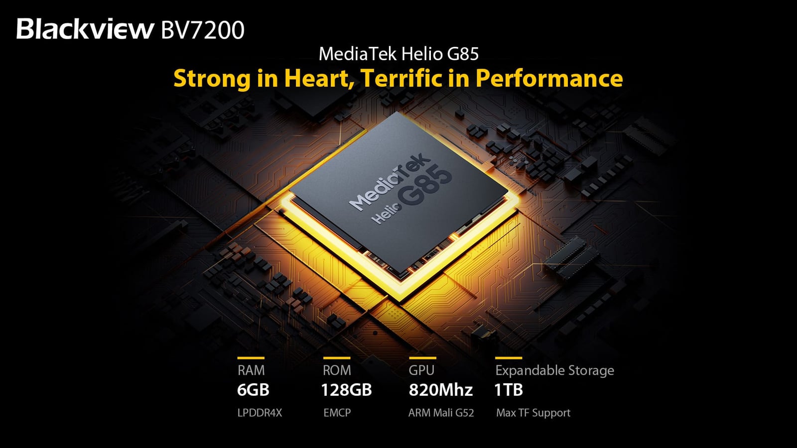 CPUの面では、Blackview BV7200はオクタコアMediaTek Helio G85を搭載し、6GB RAMと最大4GBの拡張機能を組み合わせ、OSの流暢性を40%アップさせると予想されています。ストレージ容量は、128GB ROMと最大1TB TFをサポートし、ユーザーが人生の素晴らしい瞬間やアウトドア体験の写真、動画、サウンドを保存できるようにするようである。