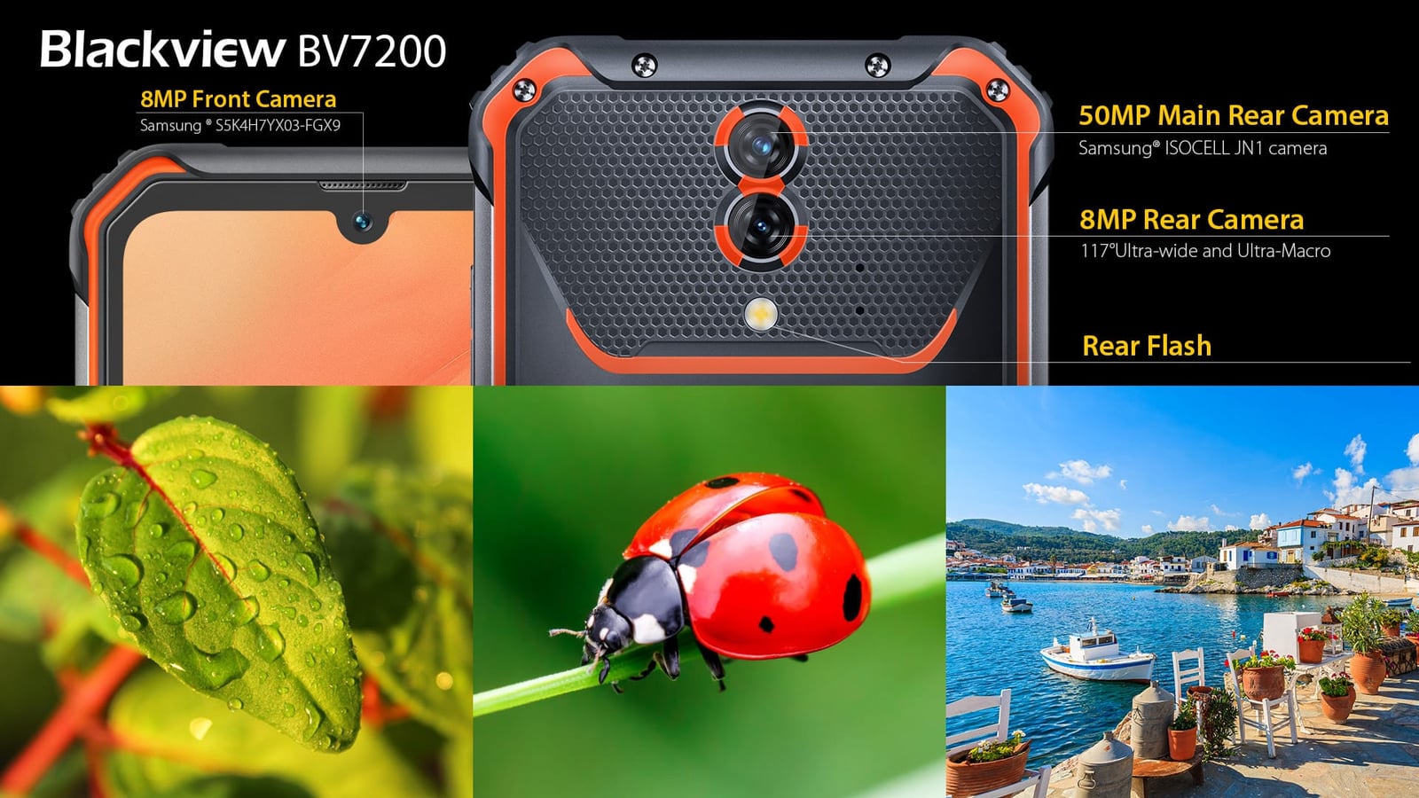 写真撮影が好きなアウトドアスポーツ愛好家のために、BV7200はフロント8MP Samsung ® S5K4H7、リア50MP Samsung ® ISOCELL JN1カメラを搭載し、4in1ピクセルビニング技術により、最大16%の光感度を向上させています。