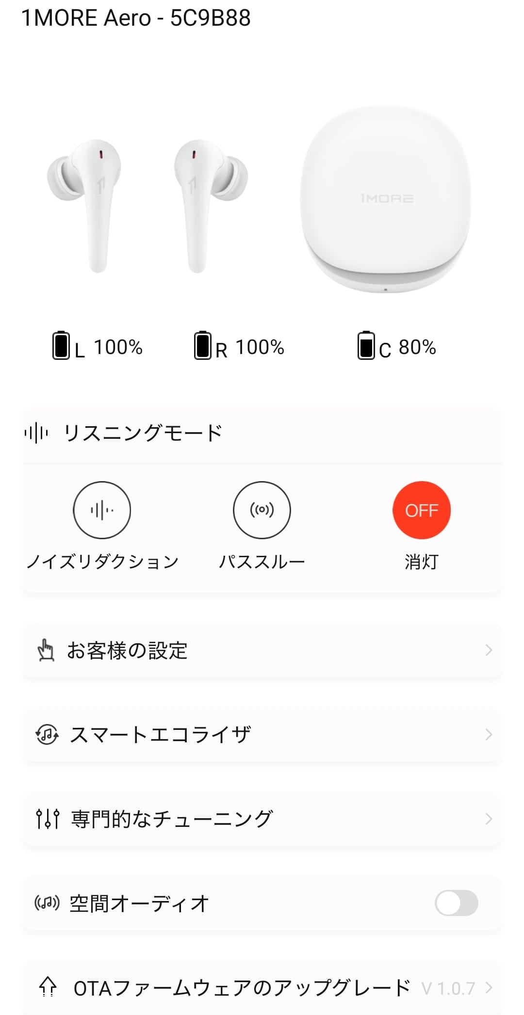 また、ケースから取り出された際に前回のノイズキャンセリングの状態に戻してくれます。再接続時にANCオフになる製品が多いので、1MOREのTWSのアドバンテージなのではないでしょうか。