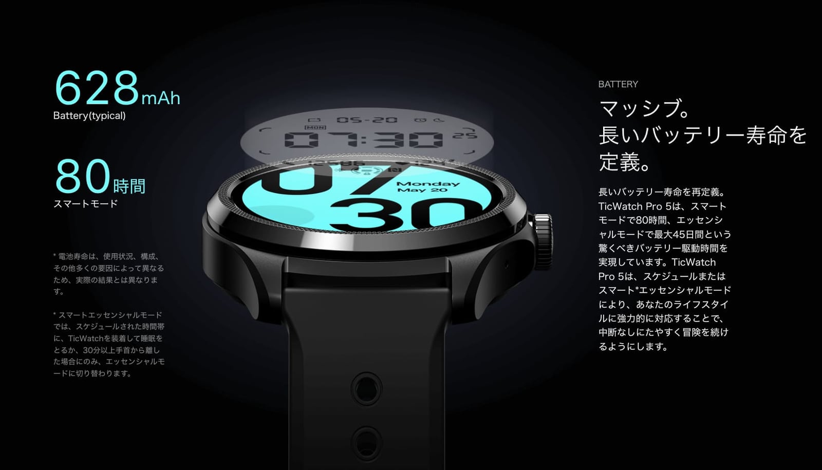 TicWatch Pro 5は、2層式ディスプレイを採用していて、Wear OSの画面(AMOLEDディスプレイ)の消灯時に、超低消費電力ディスプレイ(FSTN液晶)が表示させてバッテリー持ちが良くなるようになっています。