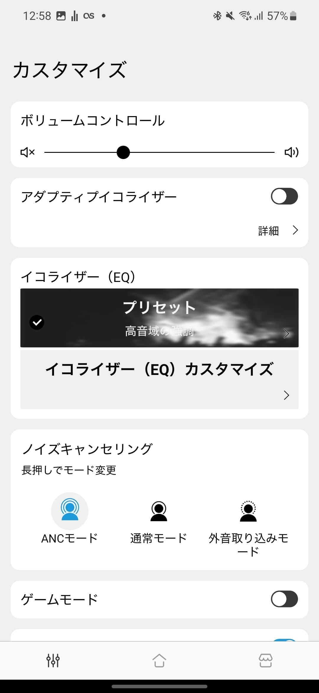 専用アプリはボタン操作で行える項目(ANCの切り替え、音量操作、ゲームモードへの切り替え)にプラスして、イコライザー設定とマルチペアリングのオンオフ設定がありました。