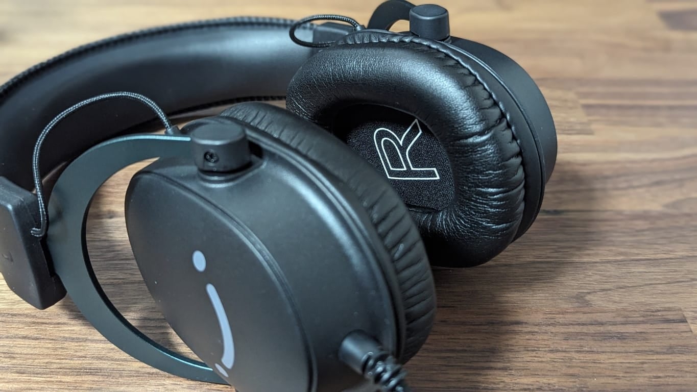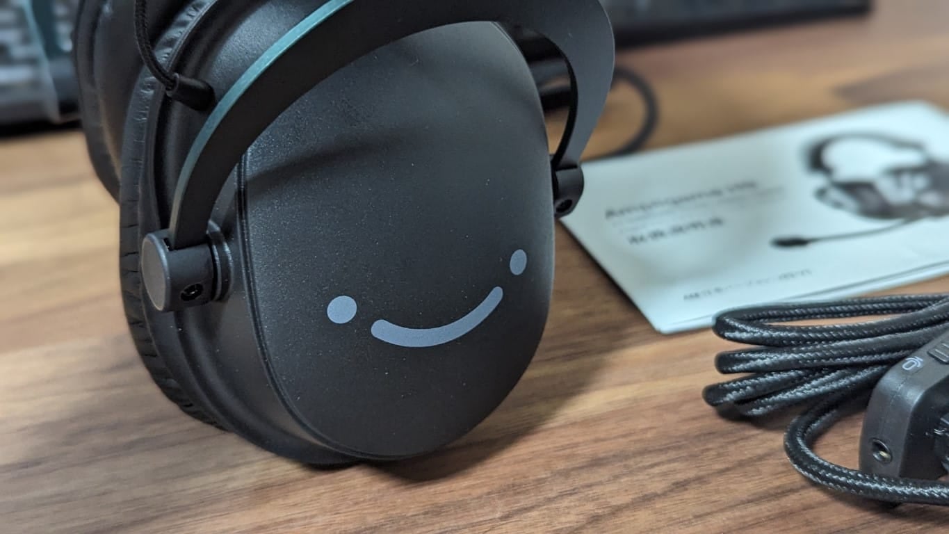 ヘッドセット本体の外観はこんな感じです。両耳サイドに特徴的なFIFINEさんのシンボルマークが書かれています。可愛らしい顔ですね。