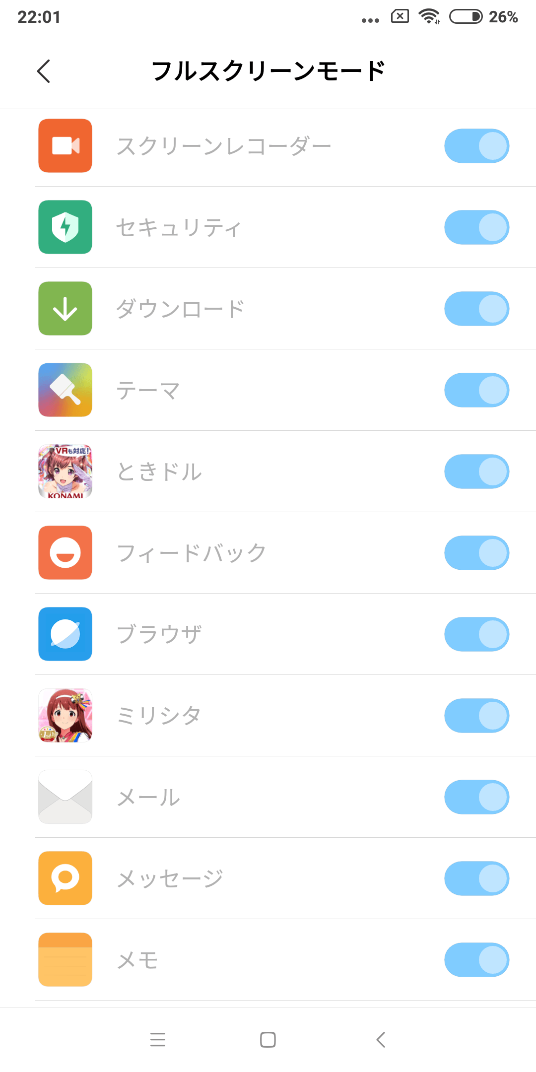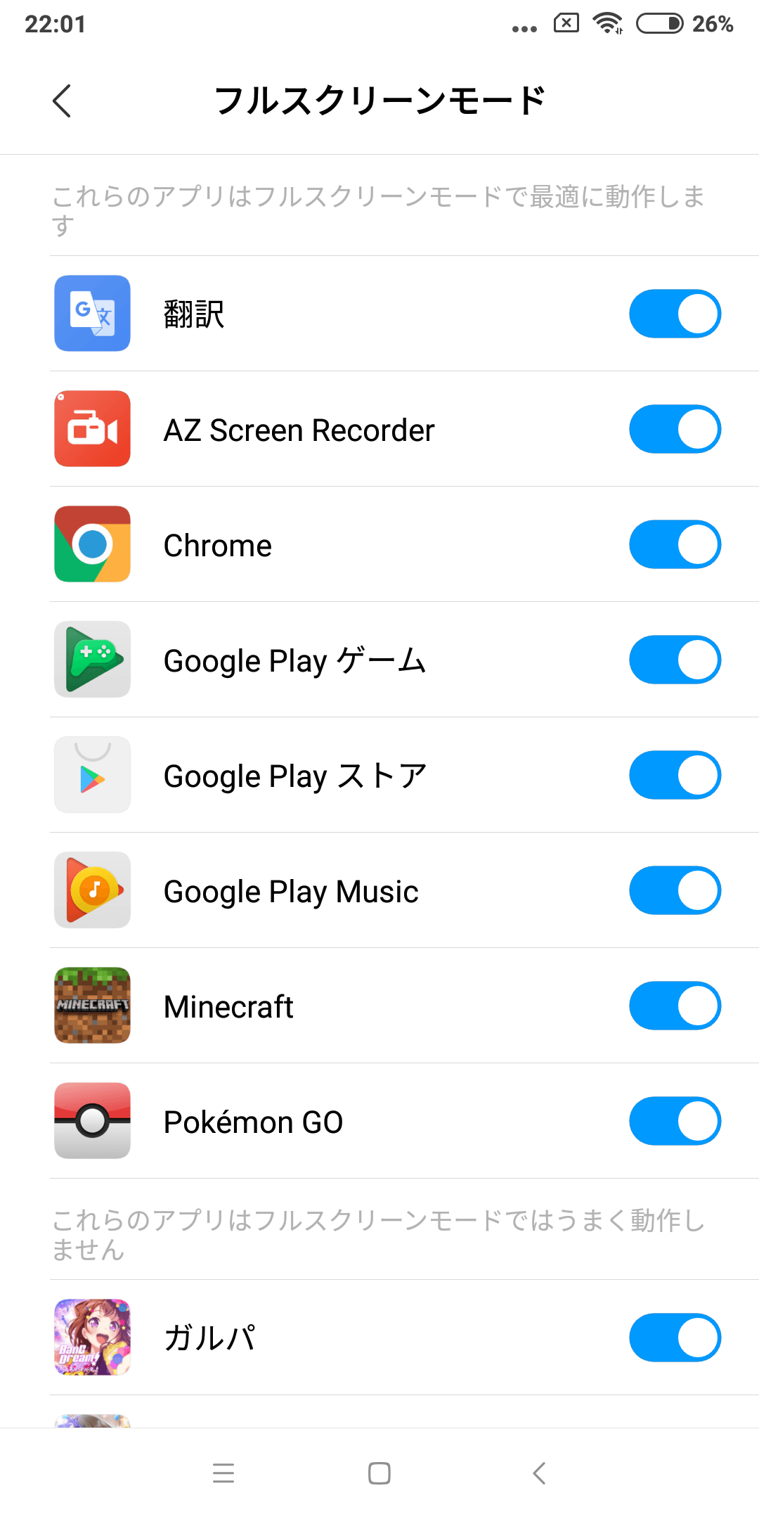 18:9表示に対応したアプリでも何故か全画面表示非対応とされて16:9になってしまうこともありますが、設定でフルスクリーン設定をすることで、この問題を解決できます。