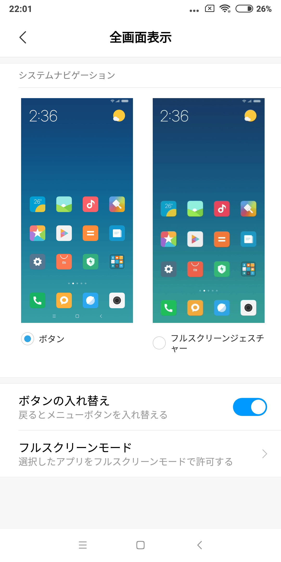 「設定アプリ」→「全画面表示」→「フルスクリーンモード」から変えられれます。