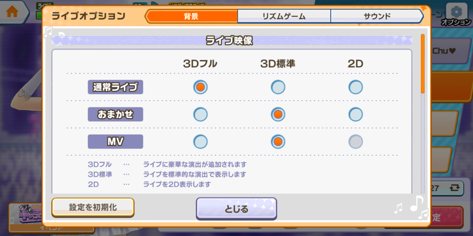 ライブ映像「3Dフル」で解像度が「標準」でギリギリ遊べるレベル。 快適さを求めるなら「3Dフル」「低画質」設定からです。
