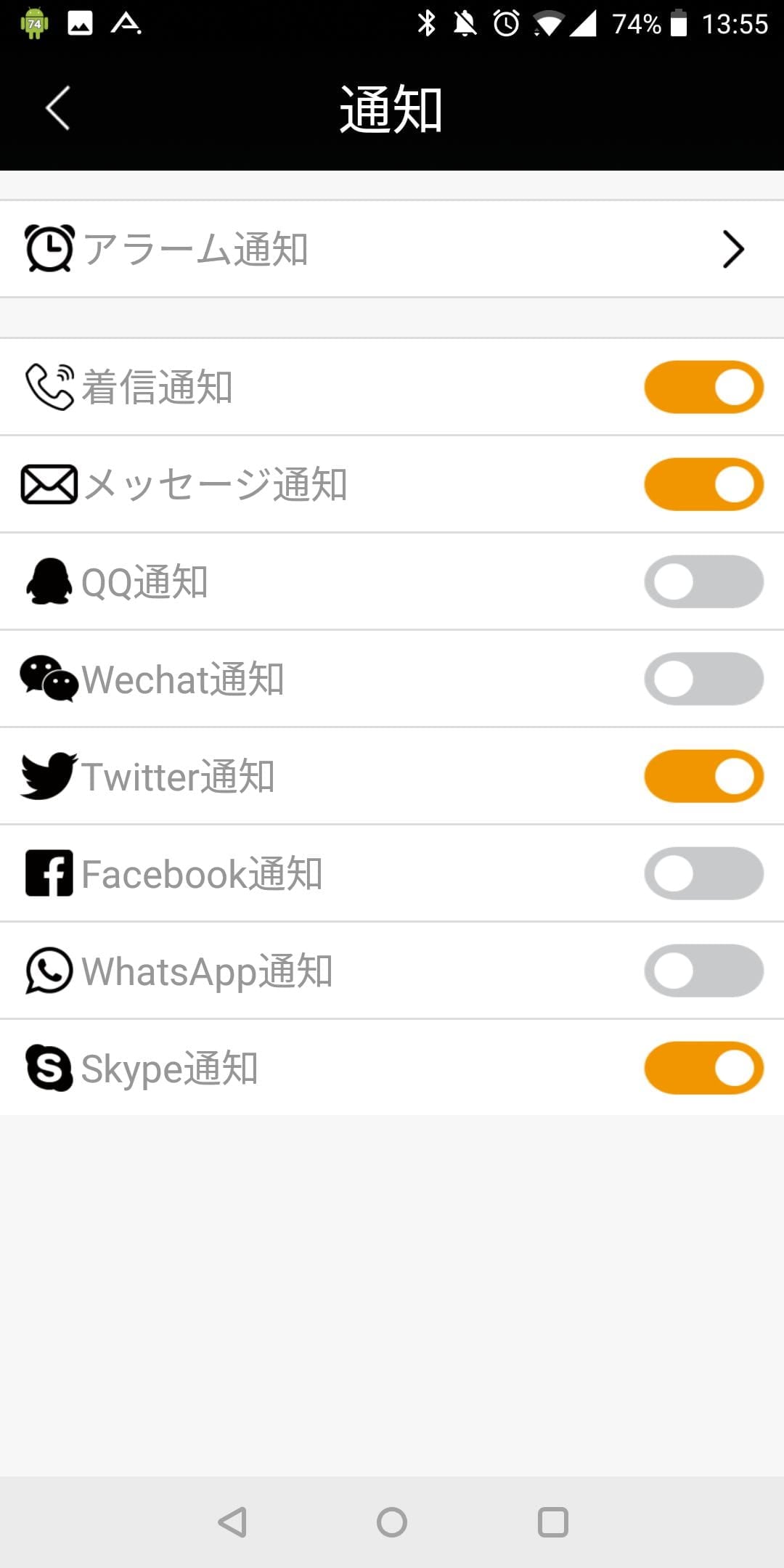 ブザーによるスマホ通知が可能なアプリが限られていて、多くのスマートウォッチが好きなアプリを設定できるのに対し、管理アプリ側がそれに対応していないため、通知可能なアプリは「電話着信」「SMSメール通知」「QQ(中国のLINEのようなメッセージサービス)」「Wechat(左に同じ)」「Twitter」「Facebook」「WhatsApp」「skype」のみです。これ以外の通知は行うことが出来ません。通知方法は画面上でメールアイコンが点滅して「ピー、ピー」となるようになっています。