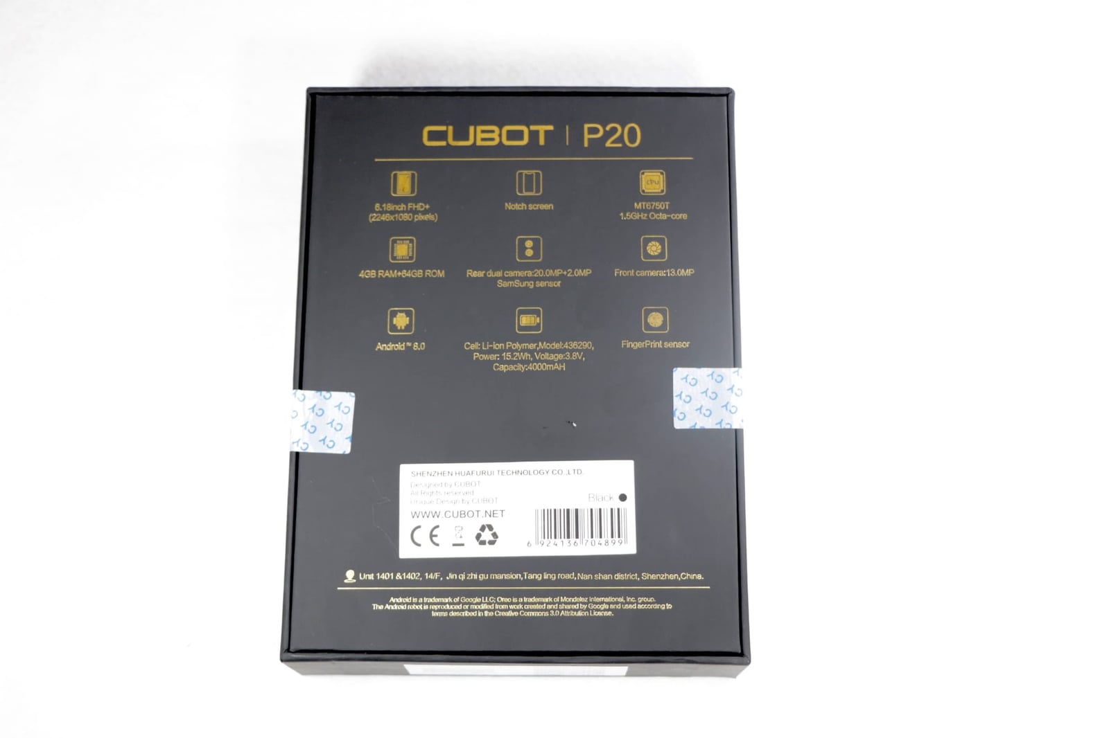 からの発送でしたが、我が家に届いたCUBOT P20の箱に貼ってあったシールがまだ開封前だったので、未開封状態での到着です。