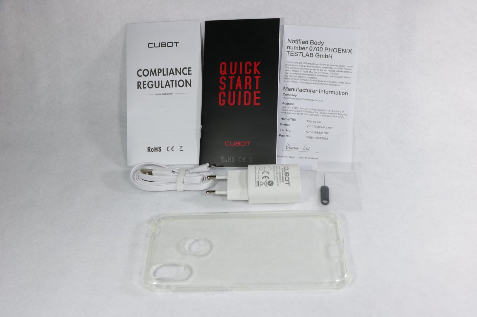 付属品は専用ケース、MicroUSB→USBケーブル、充電アダプタ(EU規格)、SIMピン、取扱説明書(英語や東南アジア系の言語)となっています。