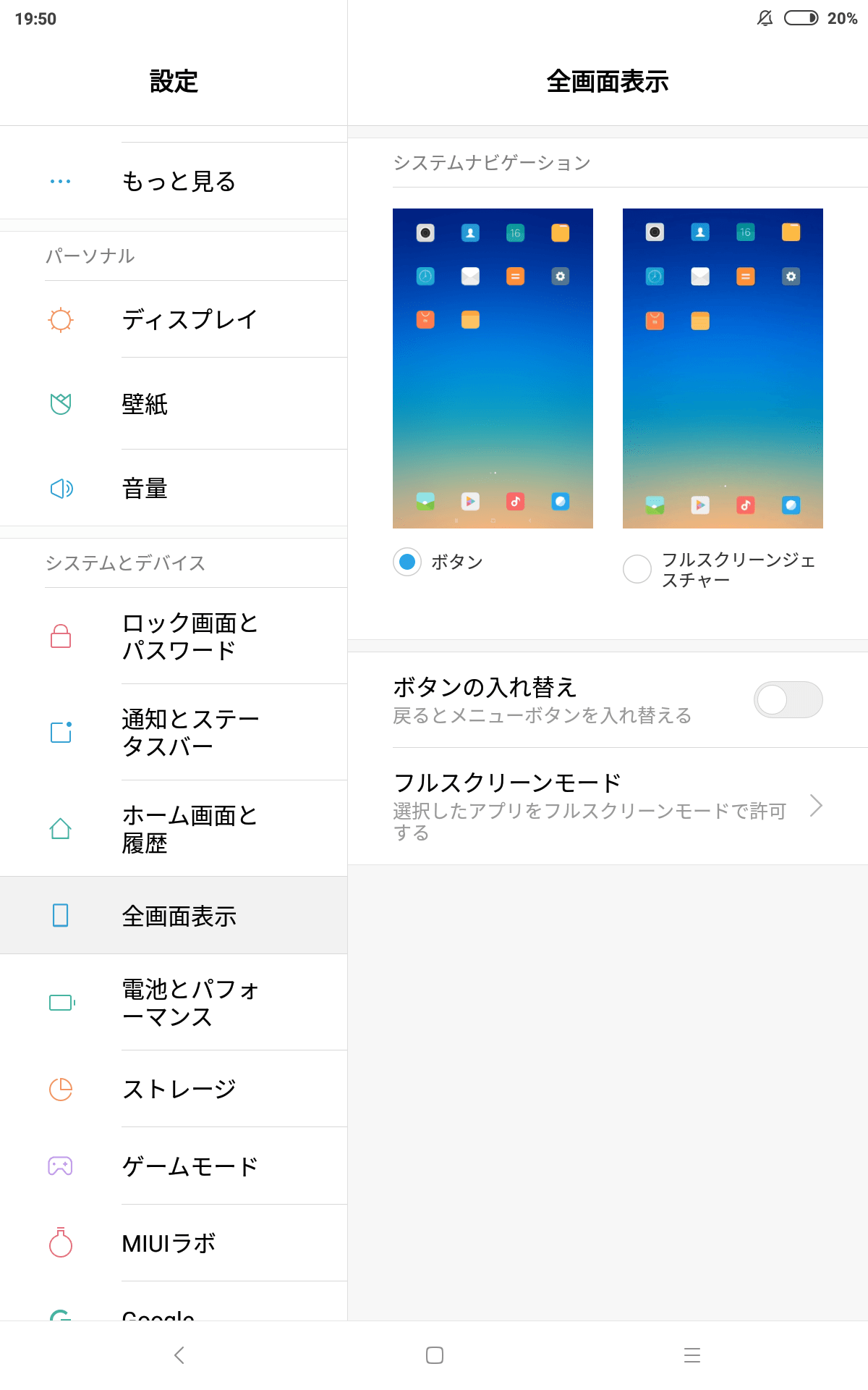 MIUIの場合、ナビゲーションボタン配置がAOSPとバックキーとタスクキーが逆で使いづらいですが、設定の「全画面表示」から「ボタン入れ替え」で変更することが出来ます。