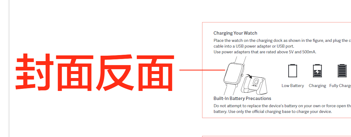 External PhotosのPDFでは充電器の形が変更になっているようですが、ユーザーマニュアルの方は初代Bipのマニュアルを流用しているようで、変更されていません。