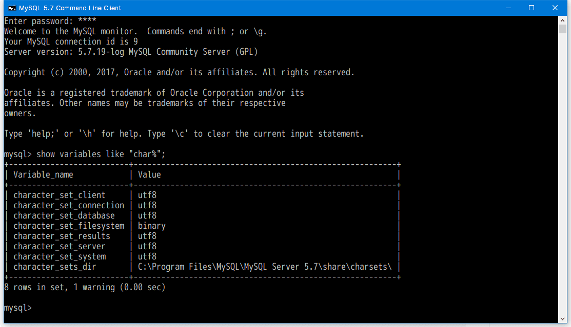 スタートメニューからMySQLを見つけて「MySQL 5.7 Command Line Client」を起動します。※2つ目の方はUnicode版らしいです。