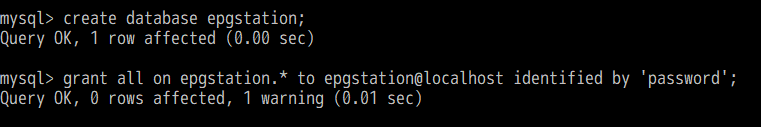 そしてgrant all on epgstation.* to epgstation@localhost identified by 'password';