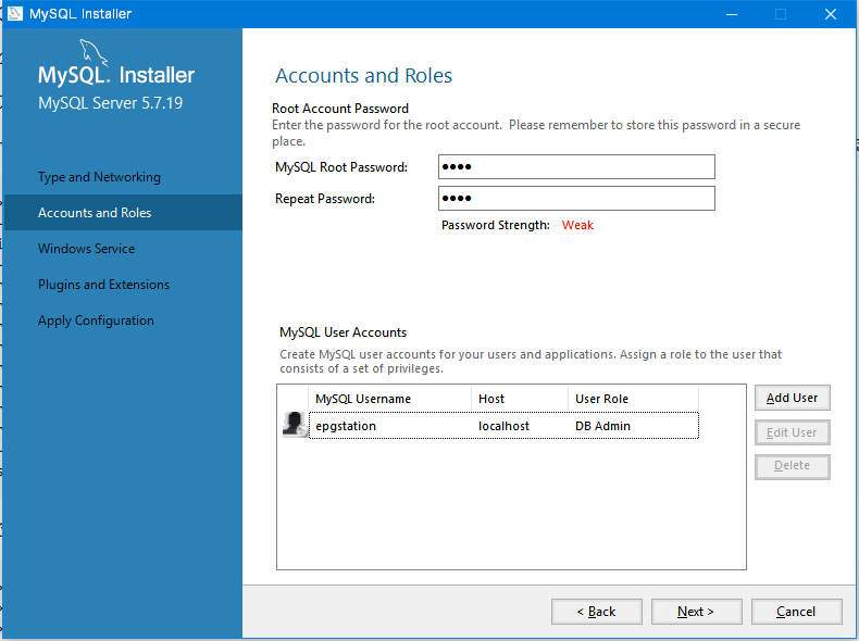 Username、Passwordを決めます。今回はUsernameをepgstation、Passwordをpasswordにしています。