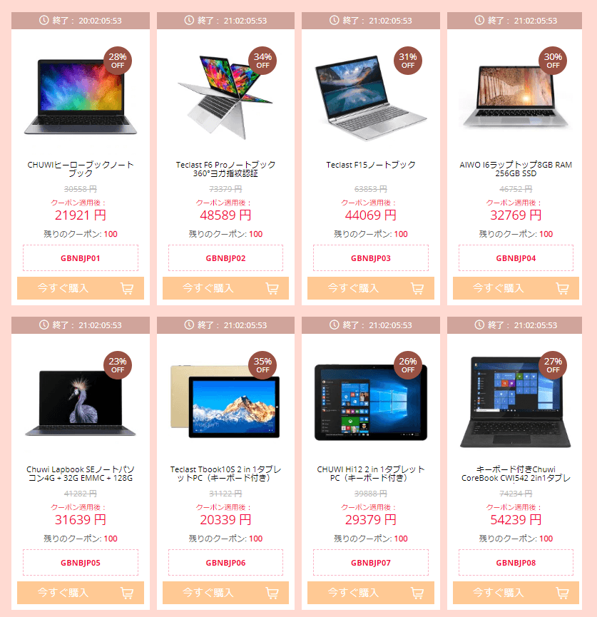 国内でも人気のChuwiのラップトップやタブレット、ALLDOCUBEタブレットやXiaomi、UMIDGIスマホなどの有名メーカーの商品のクーポンが公開されています。