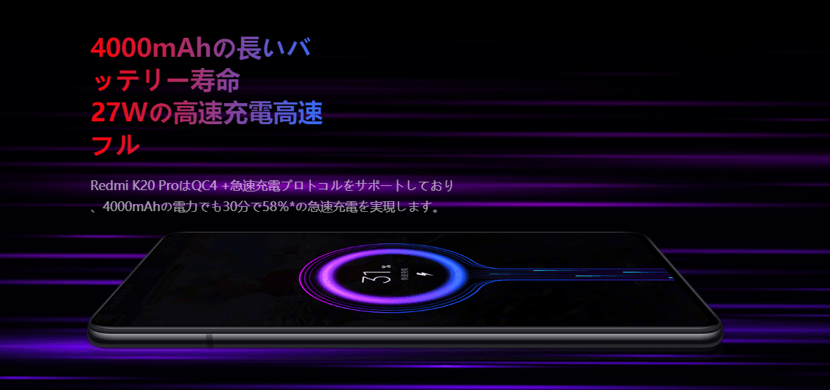 Xiaomi Mi9に搭載されて話題になった27Wの急速充電を搭載。