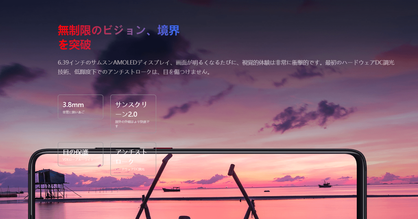 スペックがSnapdragon855、48MPカメラ、AMOLED(有機EL)ディスプレイ、ポップアップセルフィーカメラ、4,000mAhバッテリーなどと、最近のハイエンドスマホの機能が全部入りのスマートフォンになります。