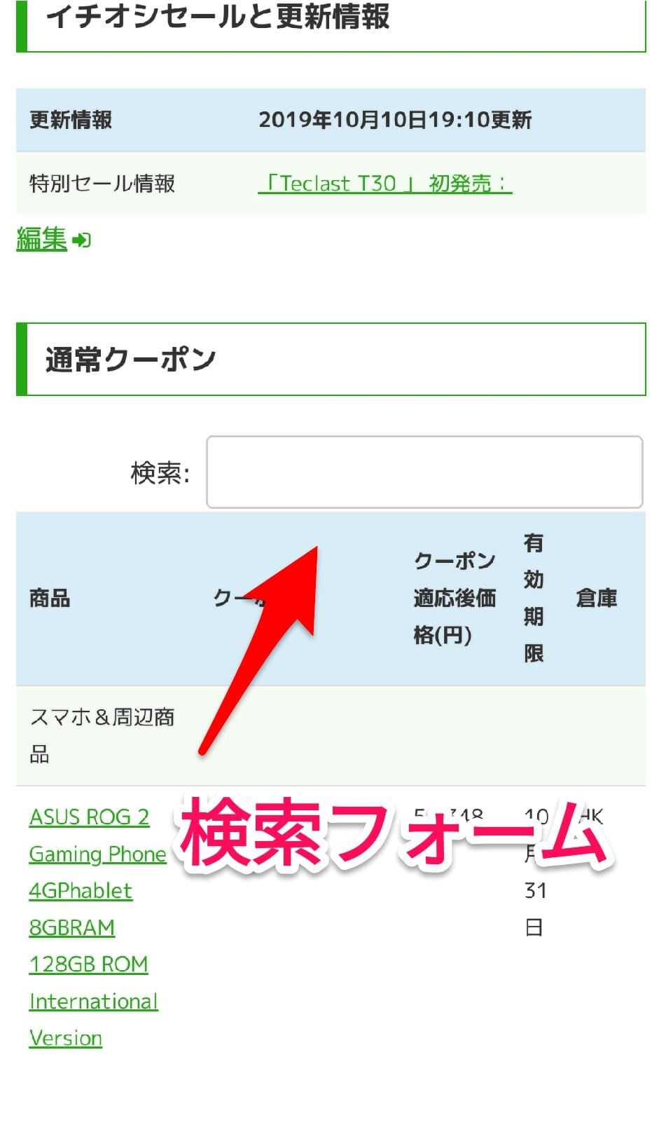 各ページの表の右上に検索フォームを配置しています。お目当ての商品や、型落ちが安く手に入るかも知れません。
