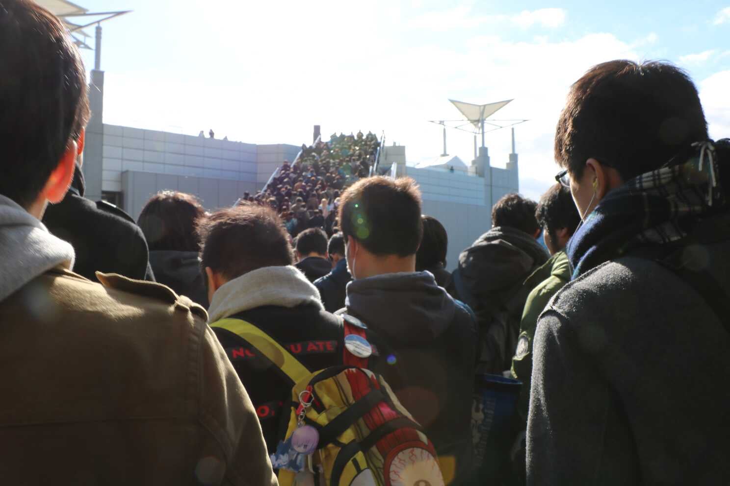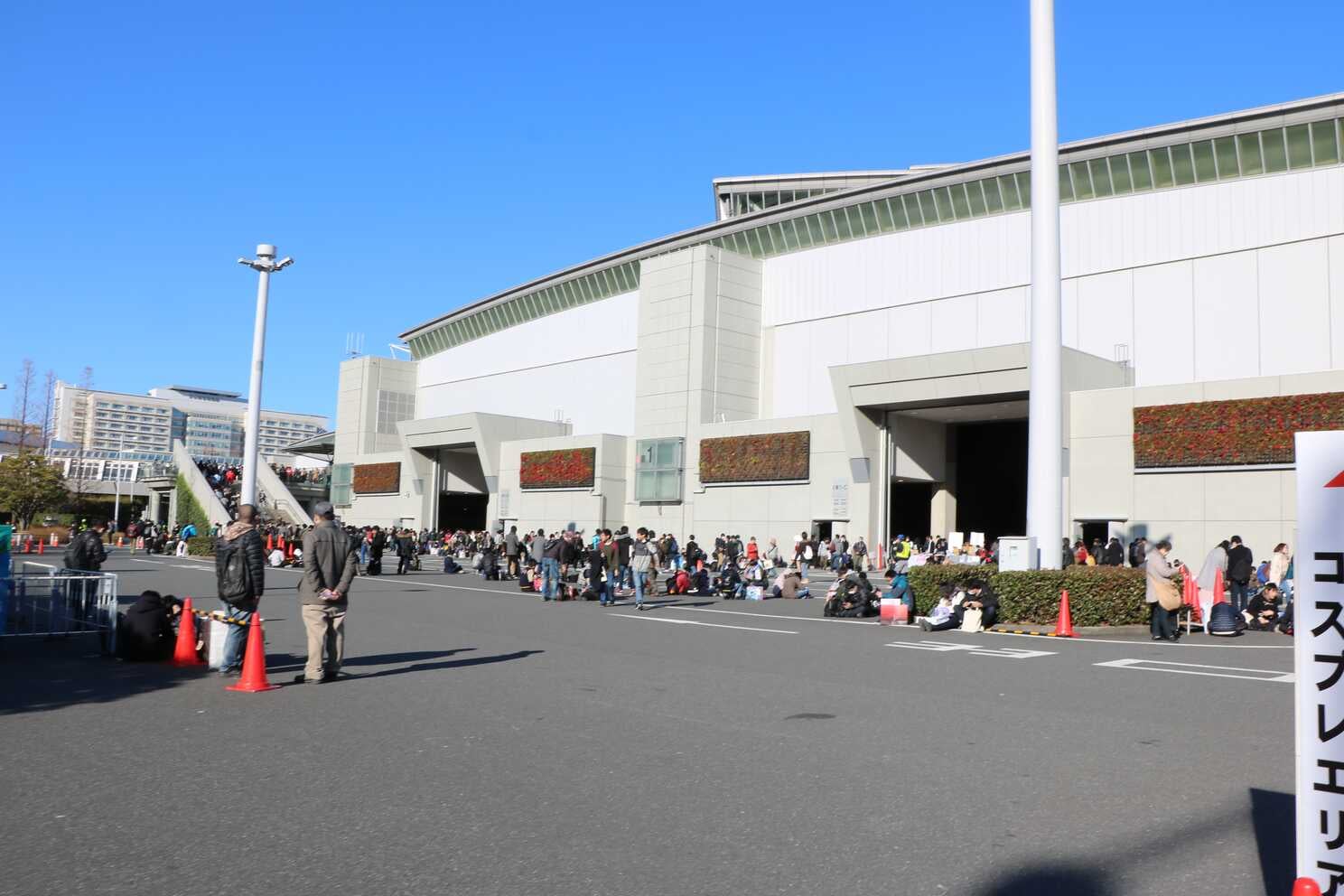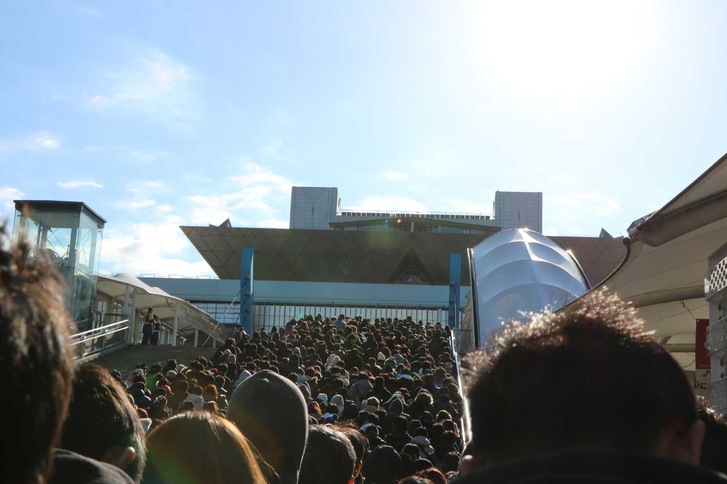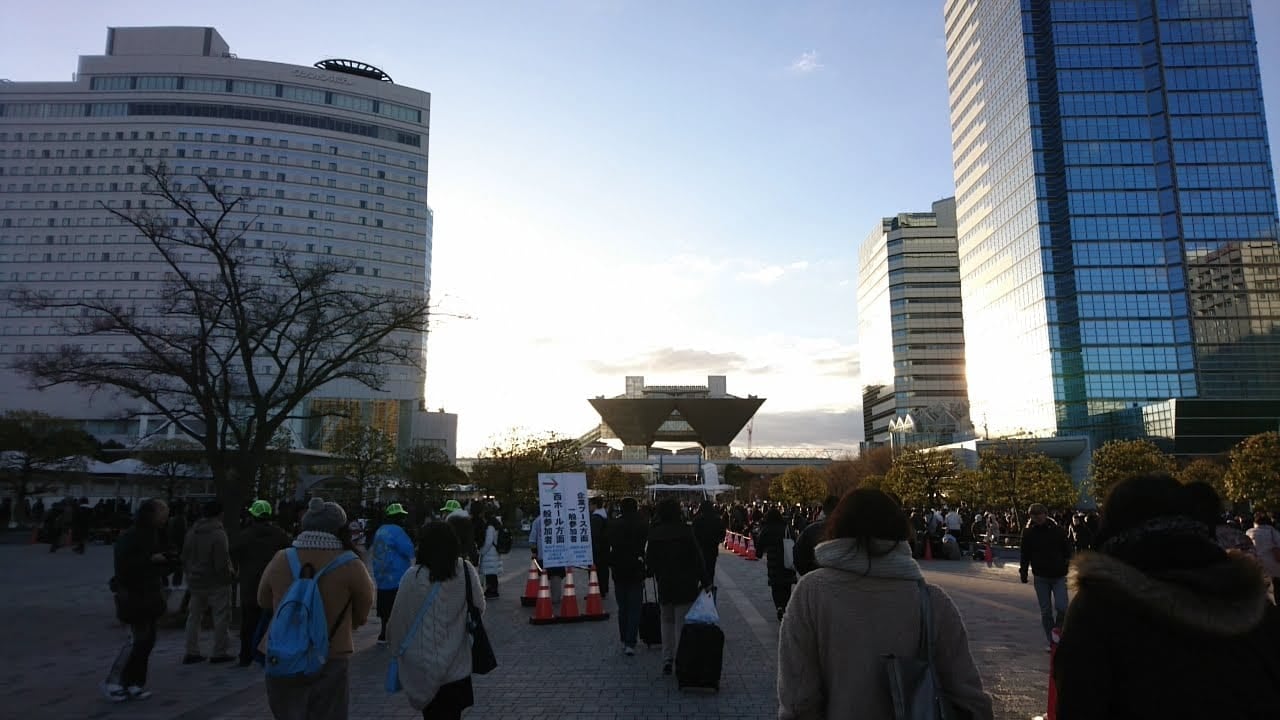 人の流れに乗っていると、あっという間に到着しました。 到着後、ビックサイトの前に並ぶのかと思いきや右側に行列は続いていて、随分後の方に追いやれてしまいました。