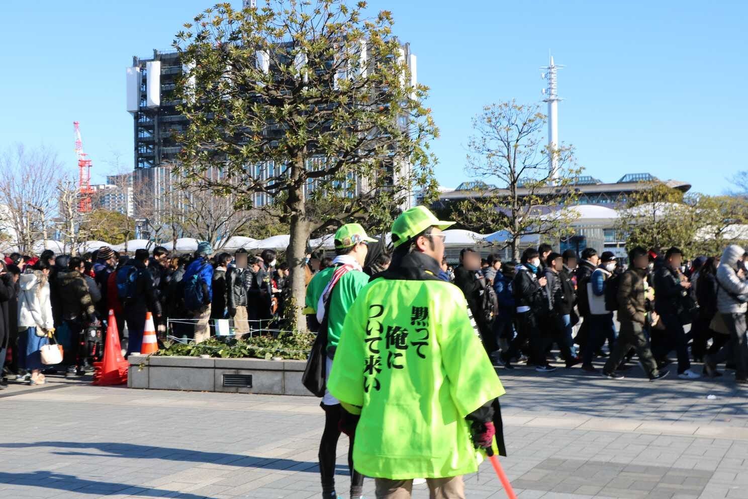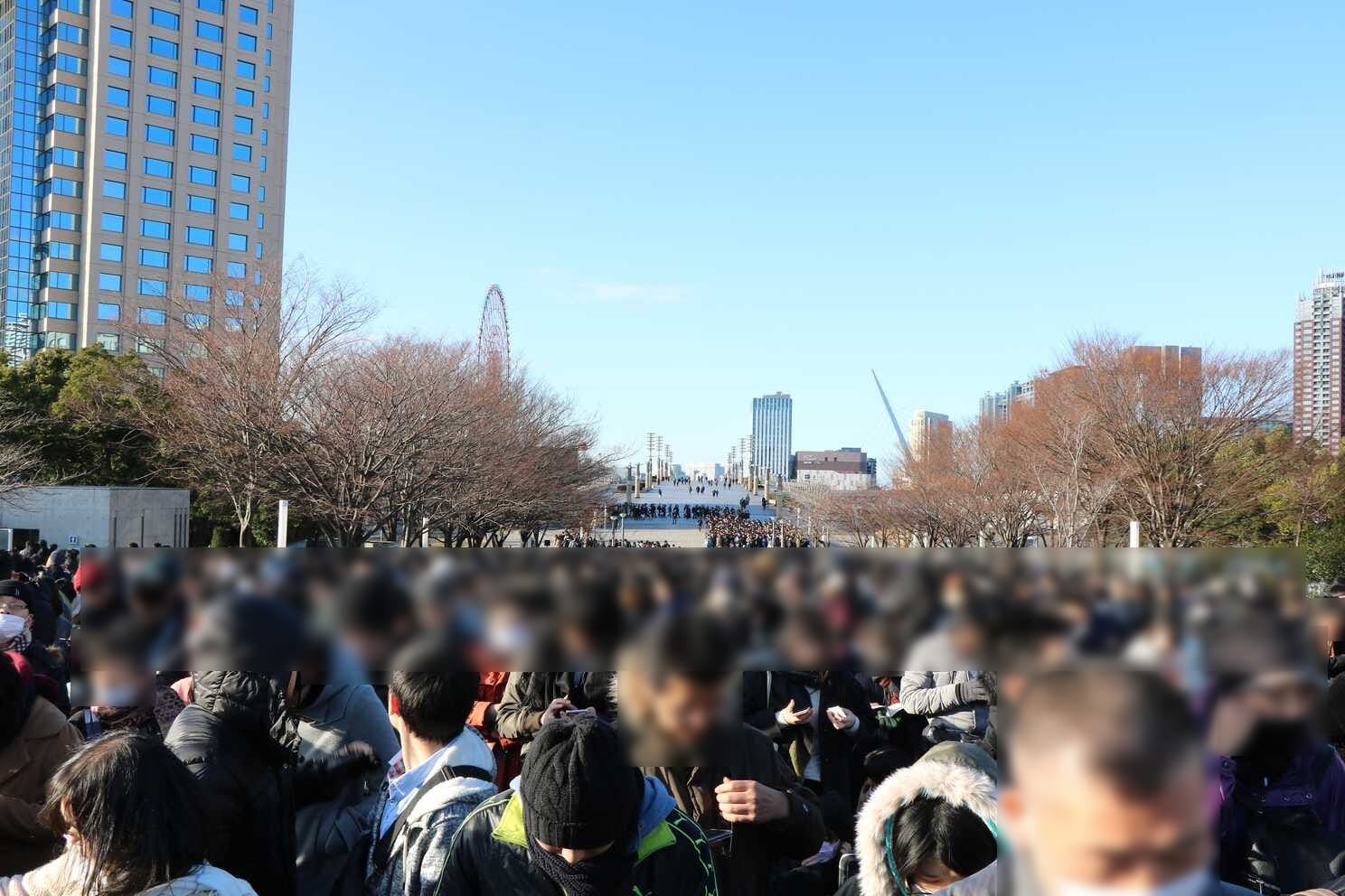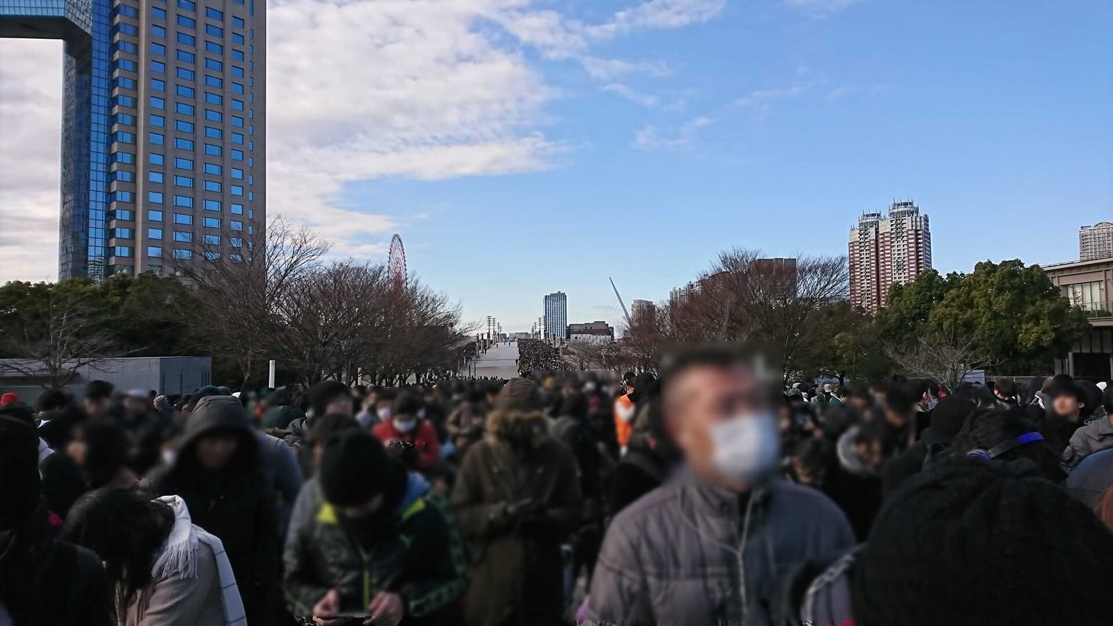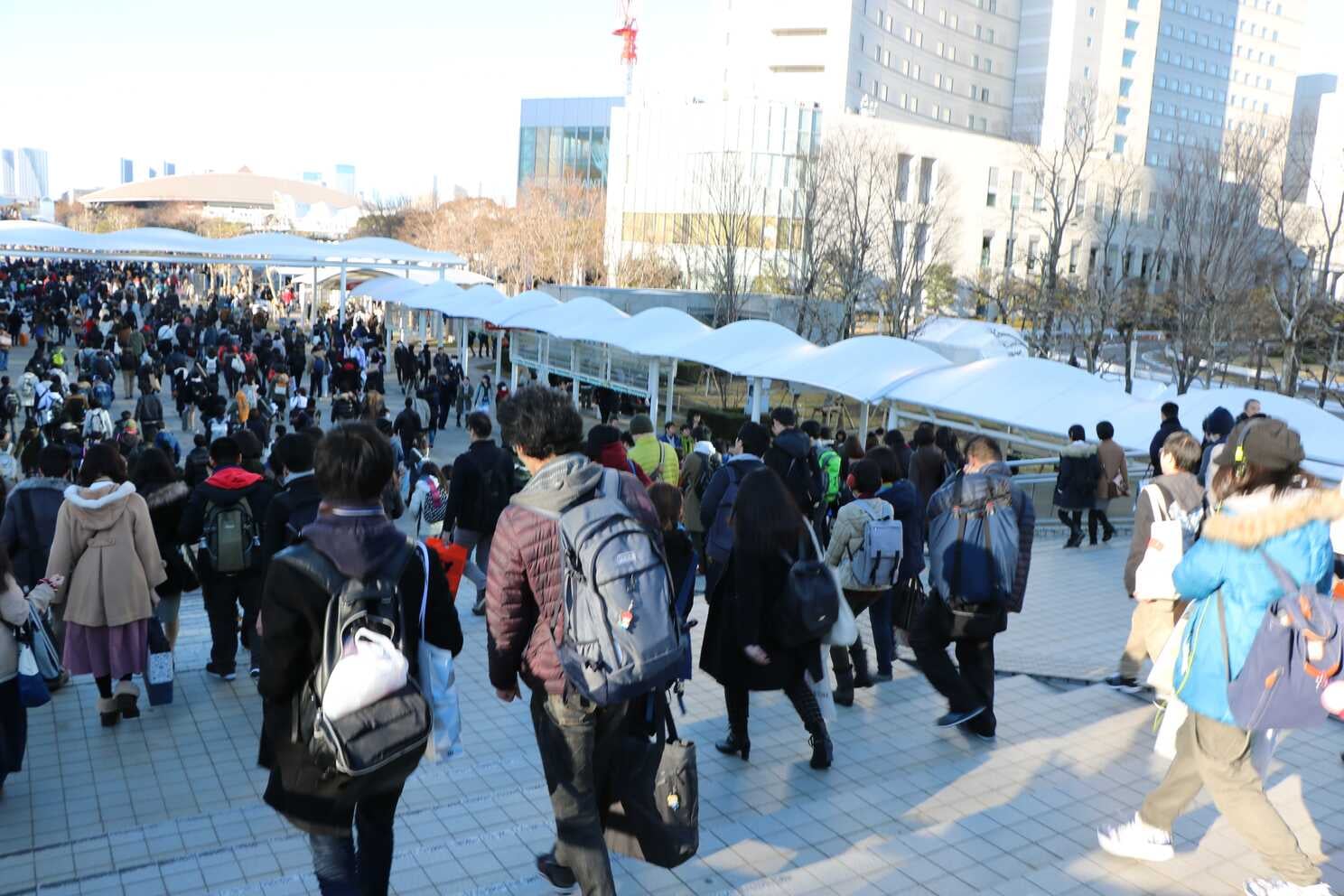 人の流れに乗っていると、あっという間に到着しました。 到着後、ビックサイトの前に並ぶのかと思いきや右側に行列は続いていて、随分後の方に追いやれてしまいました。