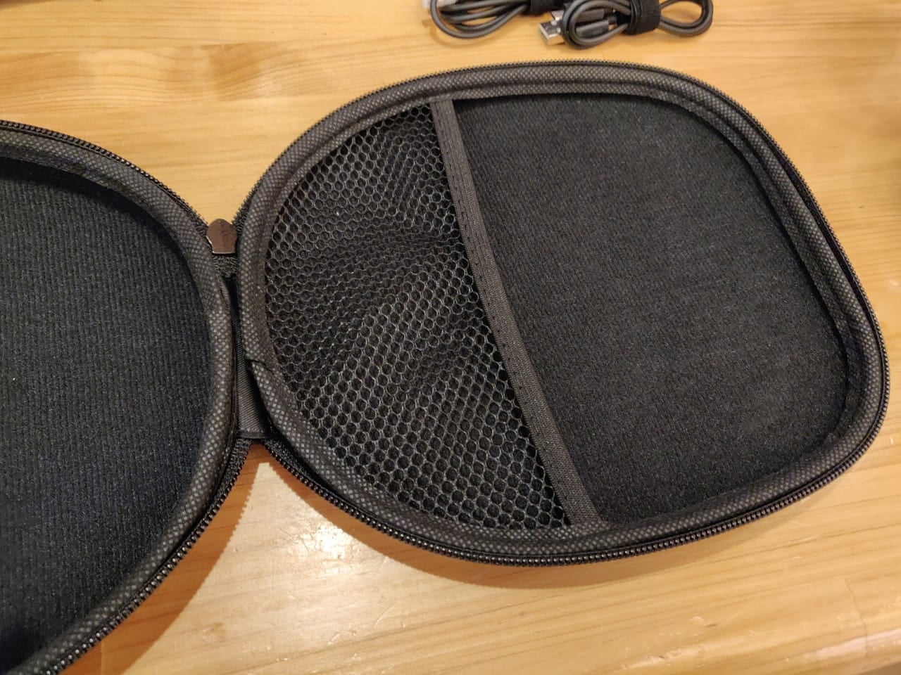 充電用のMicroBケーブル、有線接続用のケーブル、ハードケース、黒いフェルト製の袋がついています。