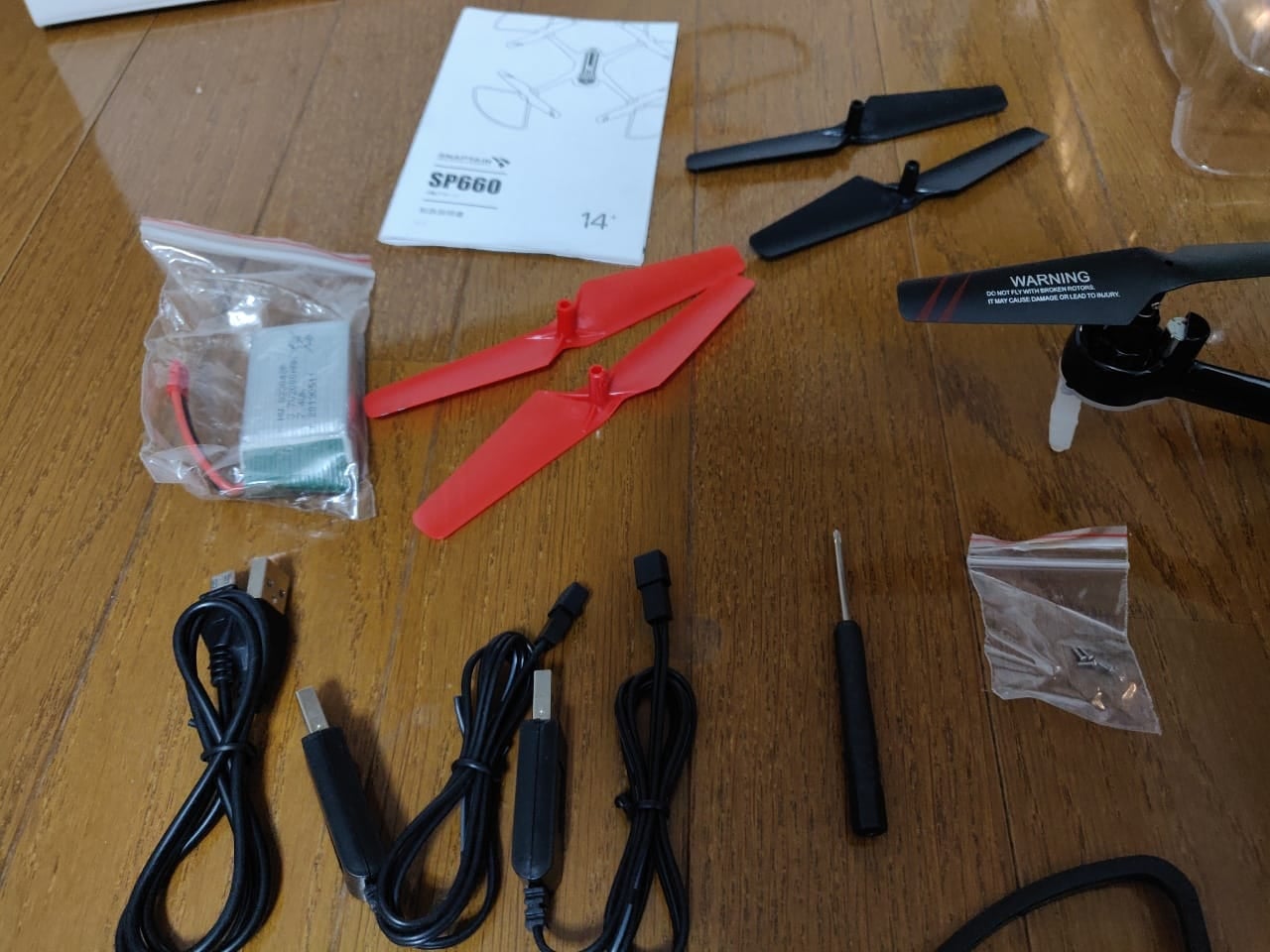 稼働に必須なコントローラーと本体に加えて、本体の充電ケーブル2つやドライバー、交換用の羽が付属しています。