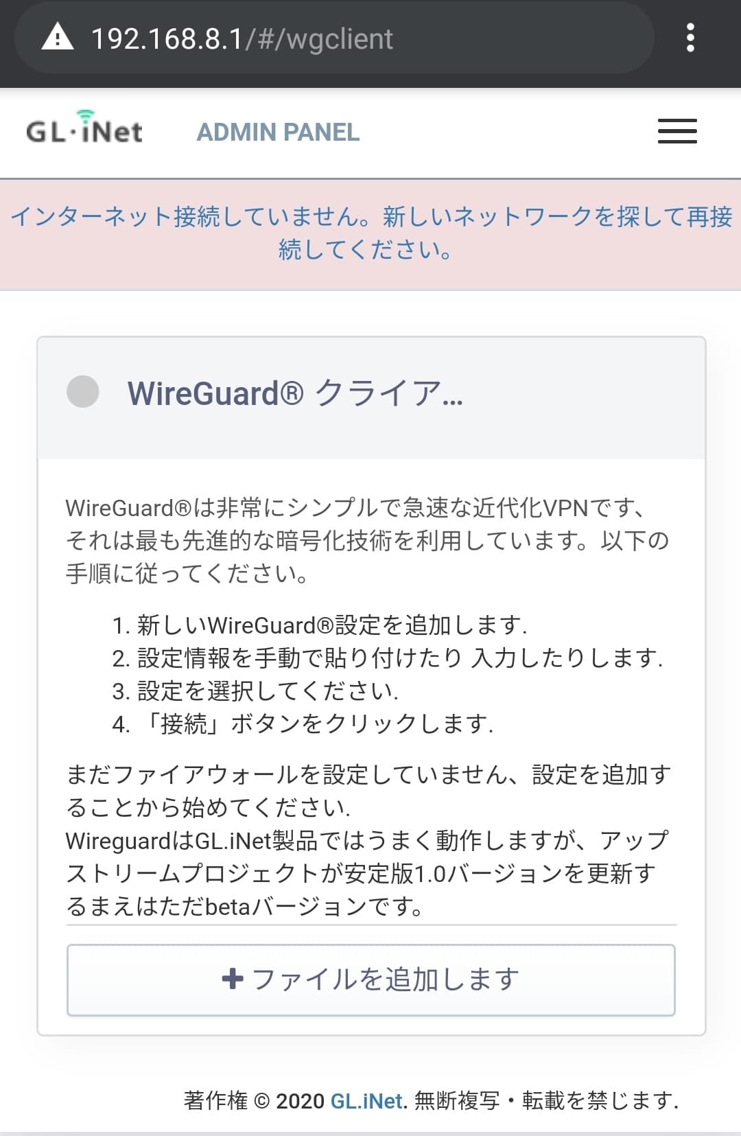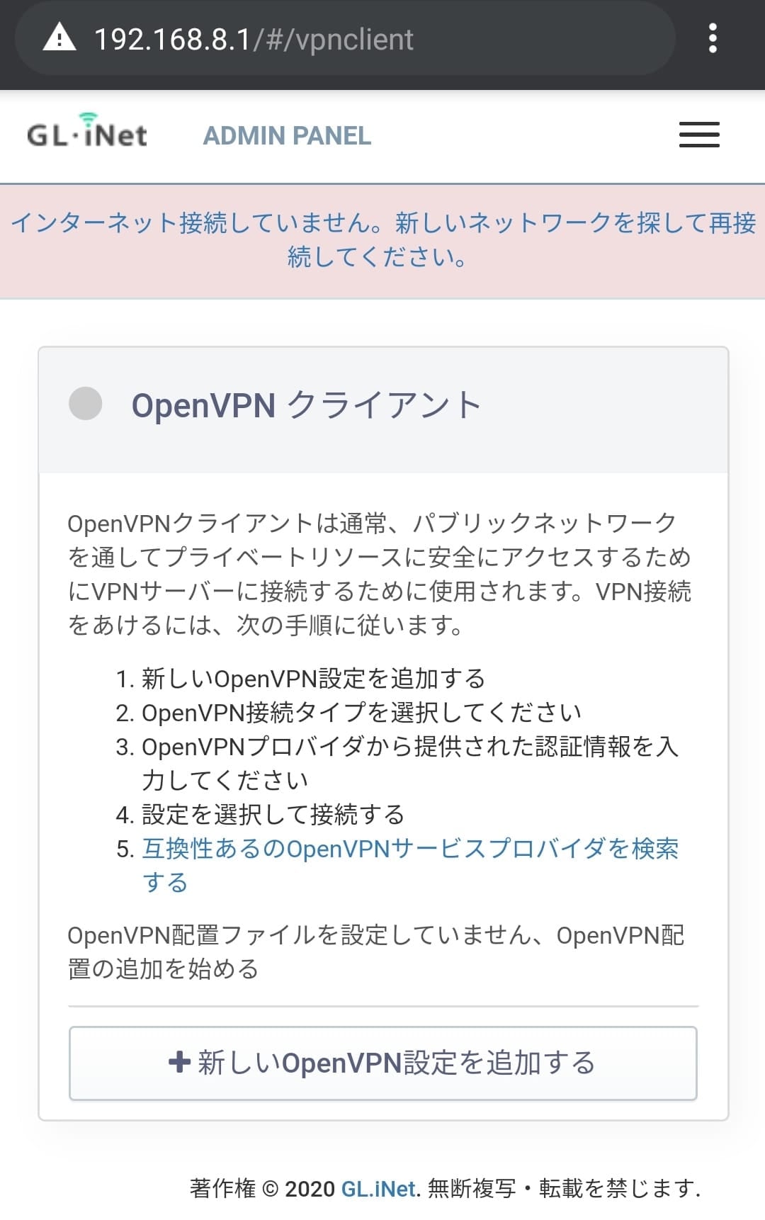 標準UIの設定画面では、OpenVPN、WireGuardの二種類に対応しています。