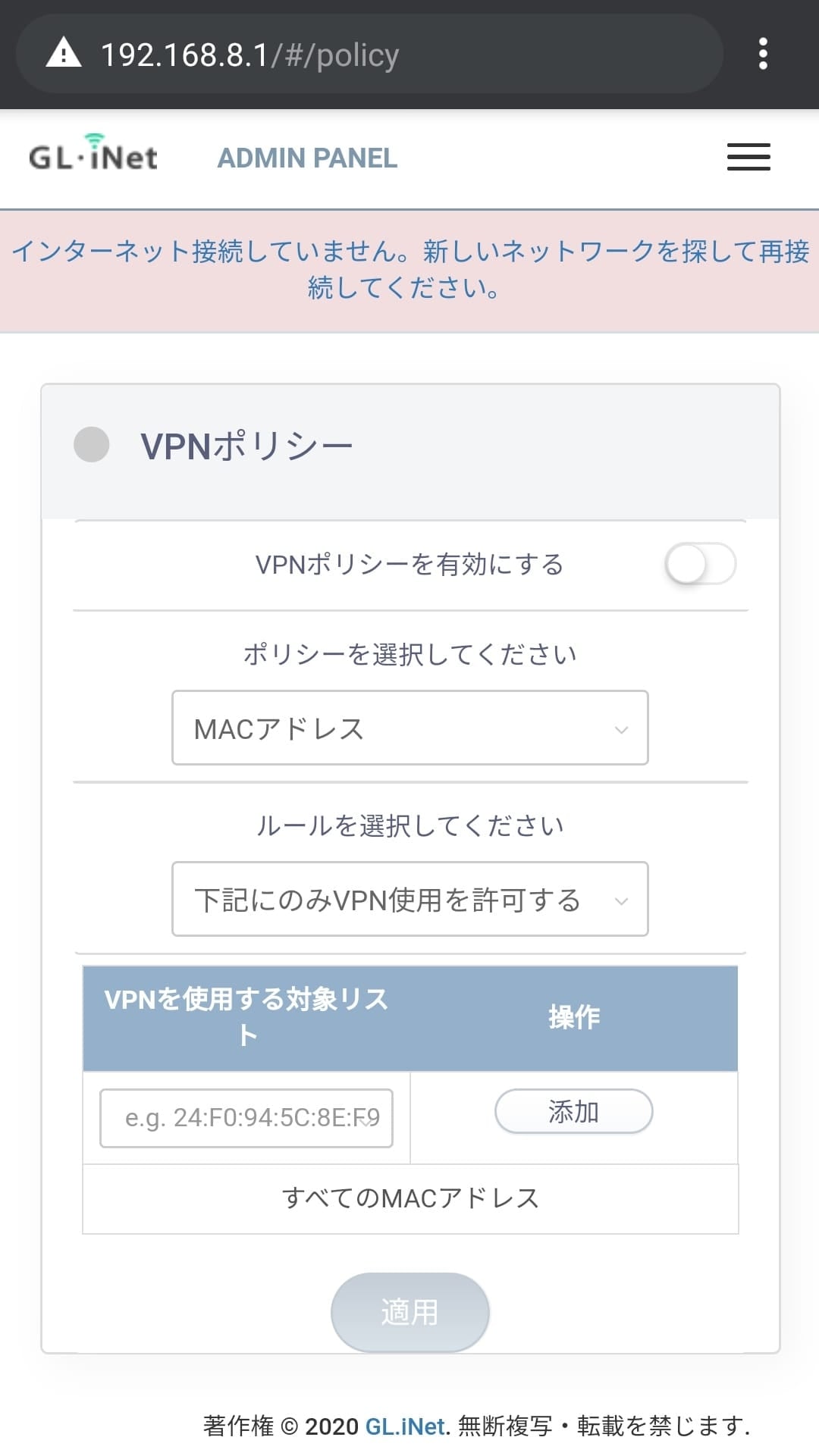 接続デバイス毎に、VPNを潜らせるかどうかの設定も出来ます。設定項目としては「VPNポリシー」となっています。