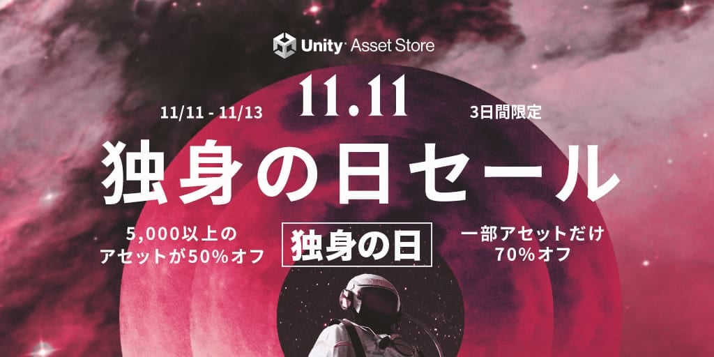 Unityの毎年恒例の独身の日セールが、日本時間の 2021年11月11日00:00〜11月13日23:59までの 72時間限定で開催されます。 今回のセールでは専用のクーポンコードを使用して、87個の特別なアセットを70%オフで、それ以外の3700個以上のセール対象アセットが50%オフで購入出来るとのこと。 一番値引率が高いので、気になっているアセットが対象商品の場合、同じ値引き率…